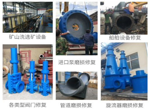主要應(yīng)用于:選礦設(shè)備過流沖蝕磨損修復(fù),如:旋風分離器,浮選柱,浮選機,泡沫罐,分級機,攪拌罐等設(shè)備的預(yù)涂耐磨層,溜槽的維修,管道配件,渣漿泵和其他設(shè)備(典型用途請參見主要物理和機械性能表)。